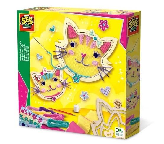 Tiul można łatwo przymocować do dwóch ramek do haftowania w kształcie kotów.