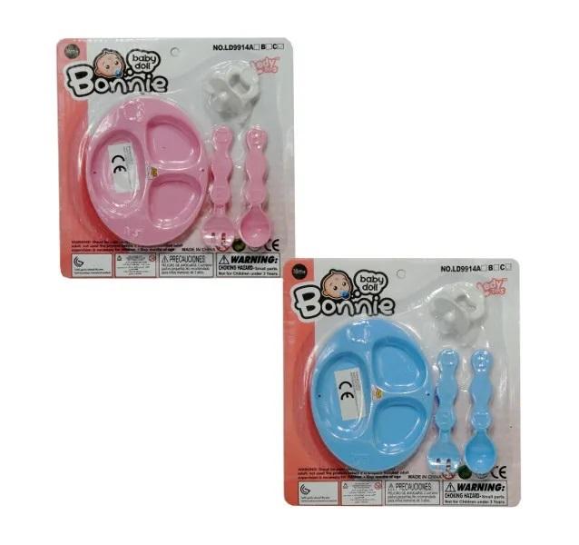 Zestaw do karmienia bobasa. W zabawce można znaleźć takie rzeczy jak: miseczka, sztućce, oraz smoczek. Produkt występuje w dwóch wersjach kolorystycznych wybieranych losowo. Cena dotyczy jednej sztuki. Produkt zapakowany w kartonową podstawkę z przezroczystym kloszem. Zabawka przeznaczona dla dzieci powyżej 3 lat.