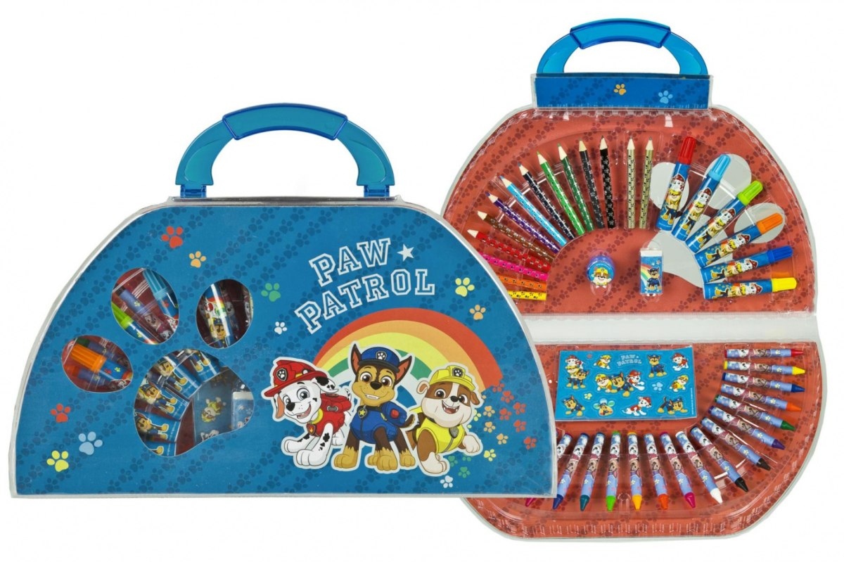 Zestaw do kolorowania Psi Patrol w półokrągłym etui z uchwytem. Zawartość: 12 mini kredek, 6 markerów, 24 kredki, gumka, 2 mini ołówki, temperówka, 4 plakaty, 1 arkusz naklejek