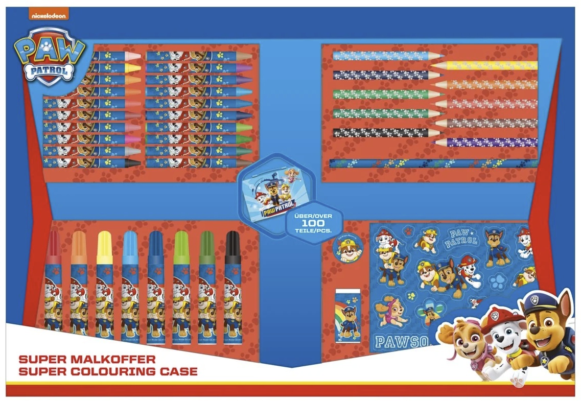 Duży zestaw do kolorowania z ulubionymi postaciami z bajki Psi Patrol . Zawartość: 20 kredek, 8 markerów, ołówek, gumka, temperówka, 4 szablony do kolorowania (14 x 10,5 cm), 15 kolorowych kartek (14 x 10,5 cm), 4 kartki naklejek (14 x 10,5 cm)