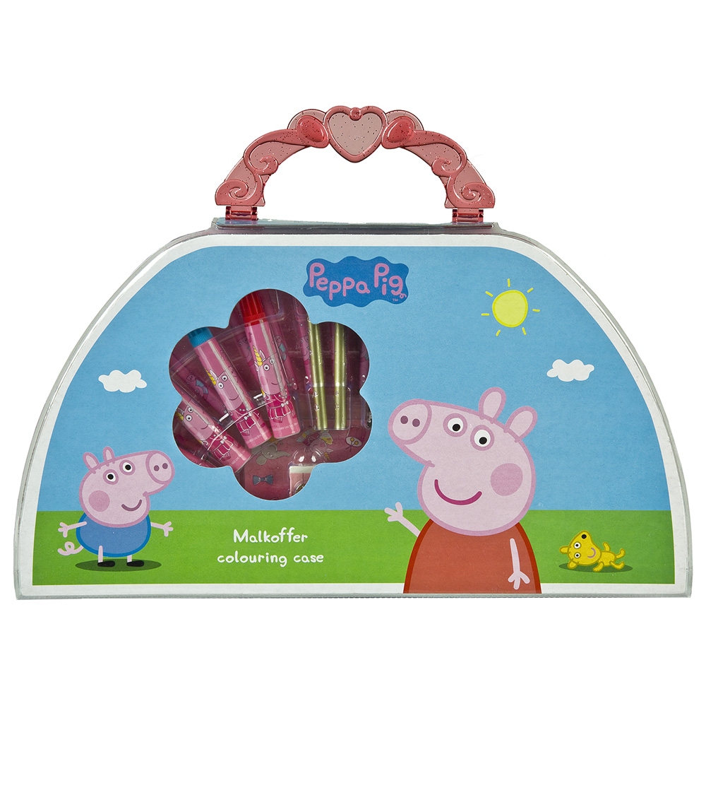 Zestaw do kolorowania Świnka Peppa w półokrągłym etui z uchwytem. Zawartość: 12 mini kredek, 6 markerów, 24 kredki, gumka, 2 mini ołówki, temperówka, 4 plakaty, 1 arkusz naklejek