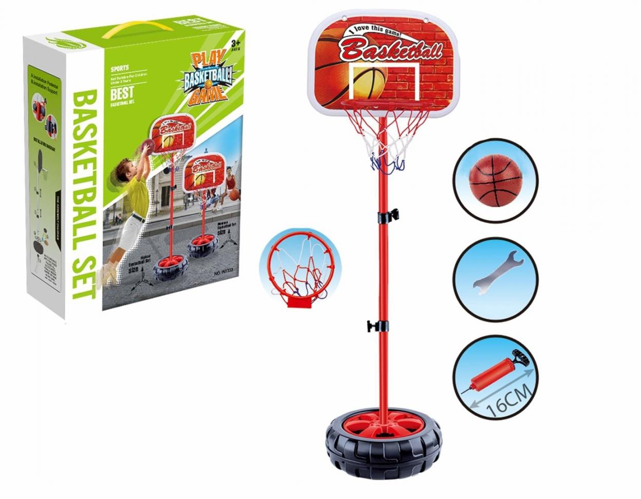 W zestawie: stojak z tablicą wys. 118 cm, kosz do koszykówki śr. 19 cm, piłka śr. 12 cm, pompka, klucz do złożenia zestawu; funkcje: regulacja wysokości stojaka; wym. opak.: 27,5 x 34,5 x 10,2 cm; 3+