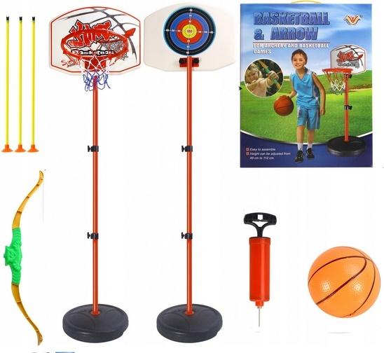 W ZESTAWIE: KOSZ DO KOSZYKÓWKI WYS. 73 - 146 CM., DWUSTRONNA TABLICA - KOSZYKÓWKA/TARCZA STRZELNICZA, ŁUK Z 3 BEZPIECZNYMI STRZAŁAMI, OBRĘCZ Z SIATKĄ, PIŁKA ŚR. 15 CM., POMPKA, PODSTAWA, WYM. OPK: 33,5 X 42 X 9,5 CM., 8+