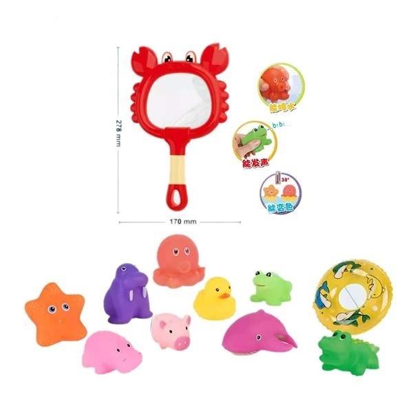 Pakowany w kartonik zestaw 6 zabawek do kąpieli z podbierakiem. Zestaw składa się z 5 gumowych zwierzątek (kaczuszka, żabka, hipopotam, lew morski, rozgwiazda), pompowanego koła ratunkowego oraz podbieraka w kształcie kraba lub ryby z ergonomiczną rękojeścią. Gumowe zwierzątka w kontakcie z ciepłą wodą zmieniają kolor.