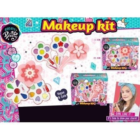 Zestaw do makijażu. Jest to zestaw kosmetyków schowany i uporządkowany w paletce w kształcie kwiatuszka.