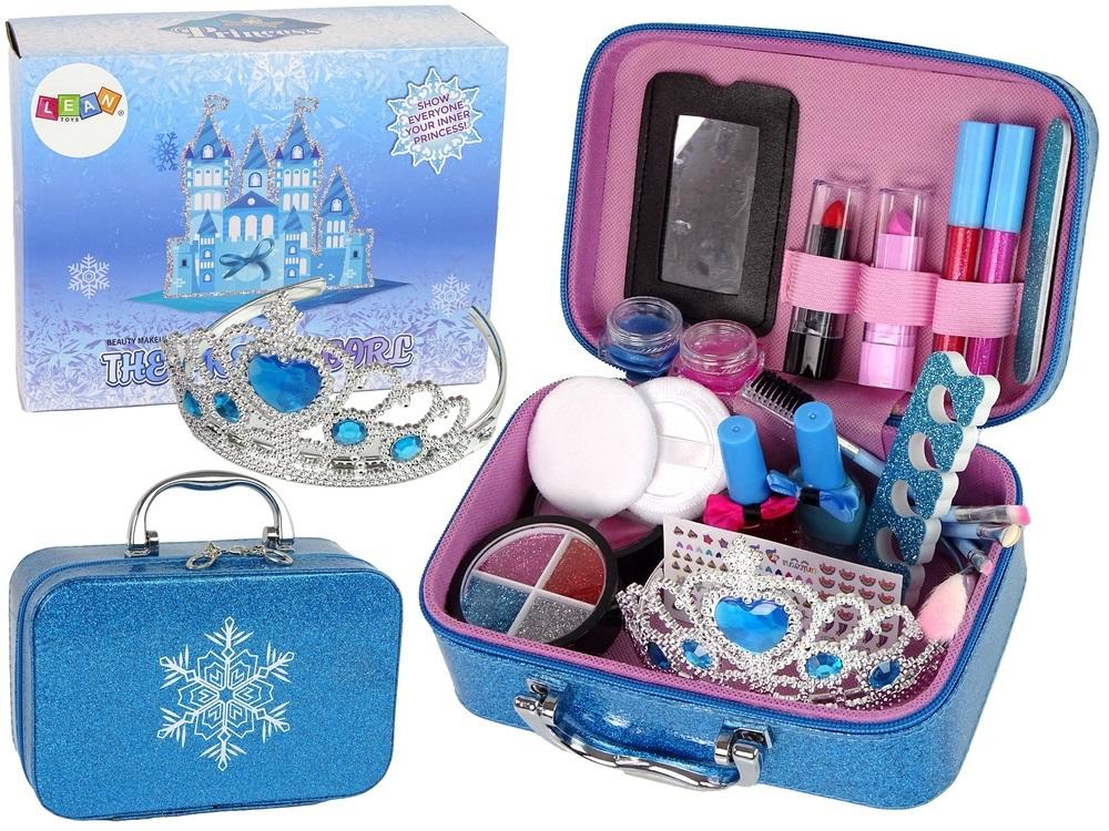 Całość znajduje się w pięknym, brokatowym kuferku ze srebrną rączką i gwiazdką w kształcie płatku śniegu. Sam kuferek jest bardzo elegancko i ciekawie wykonany. Można w nim przechowywać wszystkie swoje kosmetyki. W zestawie znajdziesz cienie do powiek, błyszczyki, szminki i do tego lusterko. Wystarczy zabrać ze sobą kuferek i masz wszystko co potrzebne, żeby móc stworzyć piękny makijaż oraz manicure.