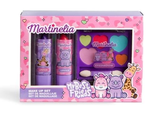 Zestaw kosmetyków dla dzieci zawiera 2 pomadki do ust oraz paletkę z cieniami do oczu i aplikator.