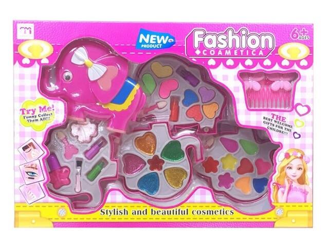 Zestaw do makijażu w kształcie słonika, który zawiera: spinkę, 4 szminki, 9 błyszczyków, lakier do paznokci, pędzelki, 13 cieni do powiek. Produkt nie potrzebuje baterii. Zabawka przeznaczona dla dzieci powyżej 6 roku życia.