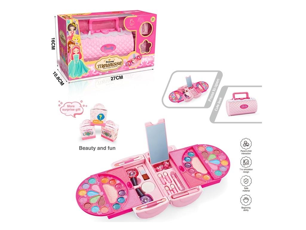 W zestawie: zamykany kuferek, cienie do powiek, 6 gąbek do nakładania, bezpieczne lusterko, błyszczyk, 2 lakiery do paznokci, pilniczek do paznokci, pędzelek, pomadka, 2 gumki do włosów, 2 pudełeczka, zabawka 3+