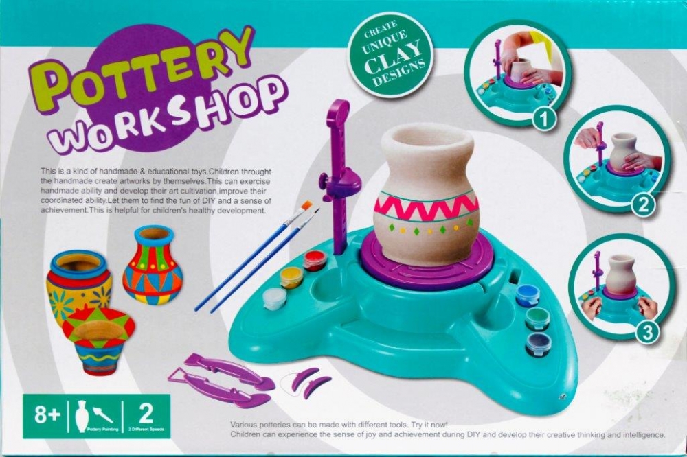 Zawartość zestawu: maszynka do ceramiki, 2x dłuta, glina rzeźbiarska, paleta   2 x pędzelek  farbki do malowania, kabel USB. Wymiary/waga/baterie  wymiary produktu  dł. x wys. x gł. cm 23x4x7, wymiary opakowania  dł. x wys. x gł. cm 36x25x8, waga produktu bez opakowania  kg 1,26 kg, waga produktu w opakowaniu  kg 1,40 kg, wymaga zasilania bateriami 3x AA1,5V-nie załączonymi do zestawu.
