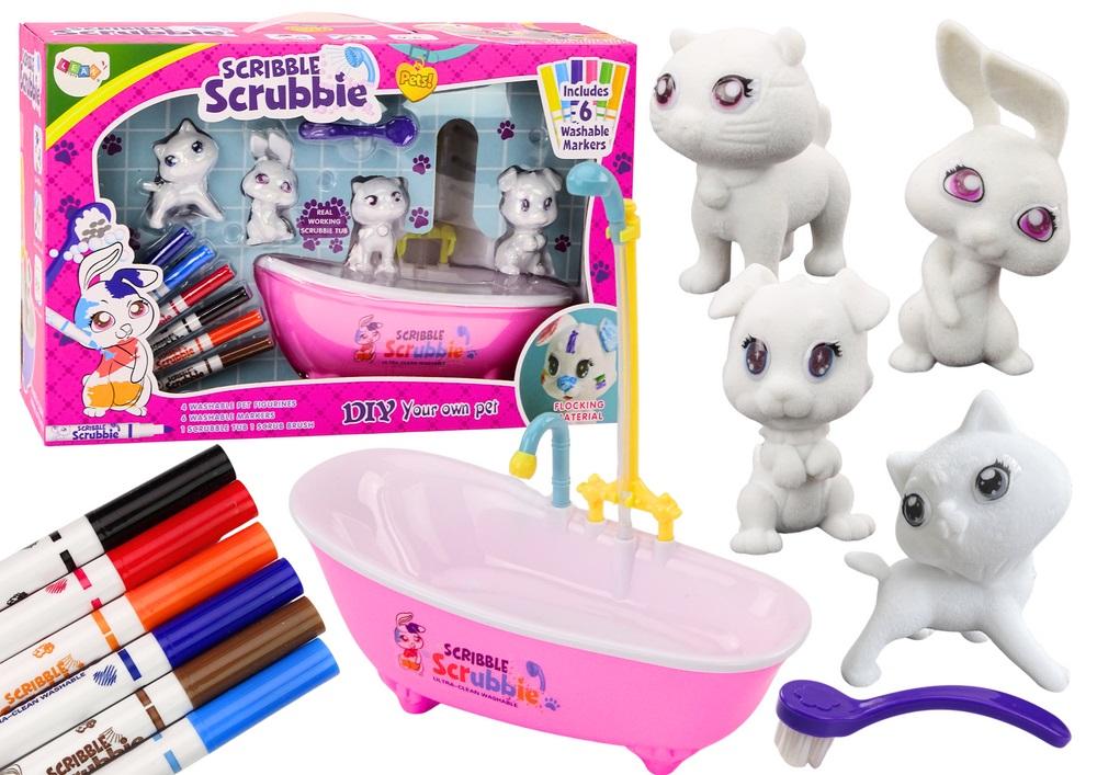 Zestaw Do Malowania i Kąpieli Zwierzątek 4 Szt Wanna Pisaki Różowy Zestaw do malowania zwierzaków to wyjątkowa zabawka, która zachwyci każdego małego artystę. W skład zestawu wchodzą cztery urocze figurki zwierzątek, które czekają na to, by zostać ozdobione według wyobraźni dziecka. Do malowania zwierzątek służy 6 specjalnych pisaków. Dodatkowo, zestaw zawiera wannę oraz szczotkę, co umożliwia zmywanie farby z figurek i malowanie ich na nowo, dzięki czemu dziecko może tworzyć niezliczoną ilość unikalnych projektów. Zabawa polega na dekorowaniu figurek zwierzątek według własnej wyobraźni i pomysłów. Dzieci mogą tworzyć kolorowe wzory, eksperymentować z różnymi stylami i technikami, co rozwija ich kreatywność i umiejętności artystyczne. Malowanie zwierzątek to nie tylko świetna zabawa, ale także sposób na rozwijanie zdolności manualnych i koordynacji ręka-oko. Dzieci uczą się precyzji i cierpliwości, malując drobne detale i dbając o każdy element swojego dzieła. Dzięki dołączonej wannie i szczotce, proces twórczy staje się jeszcze bardziej atrakcyjny. Po zakończeniu malowania, dzieci mogą zmywać swoje dzieła i zaczynać od nowa. To daje nieograniczone możliwości tworzenia i sprawia, że zabawa nigdy się nie nudzi. Wszystkie elementy zestawu są wykonane z wysokiej jakości, bezpiecznych dla dzieci materiałów. Figurki zwierzątek są trwałe i przystosowane do wielokrotnego malowania, a pisaki są nietoksyczne i łatwo zmywalne. Wanna i szczotka są zaprojektowane tak, aby ułatwić zmywanie farby, co sprawia, że cały proces jest prosty i przyjemny. Zestaw do malowania zwierzaków to doskonały wybór dla każdego dziecka, które uwielbia tworzyć i eksperymentować z kolorami. To nie tylko świetna zabawa, ale także sposób na rozwijanie ważnych umiejętności i wyobraźni. Dzięki możliwości zmywania farby i ponownego malowania, zestaw zapewnia niekończącą się radość i satysfakcję z tworzenia własnych dzieł sztuki. Wymiary wanny: 28cm x 24cm x 13cm Wymiary opakowania: 38cm x 24,5cm x 12,5cm Posiada certyfikat CE, ponadto jest zgodny z normą EN71. Przeznaczony dla dzieci powyżej 3 roku życia.