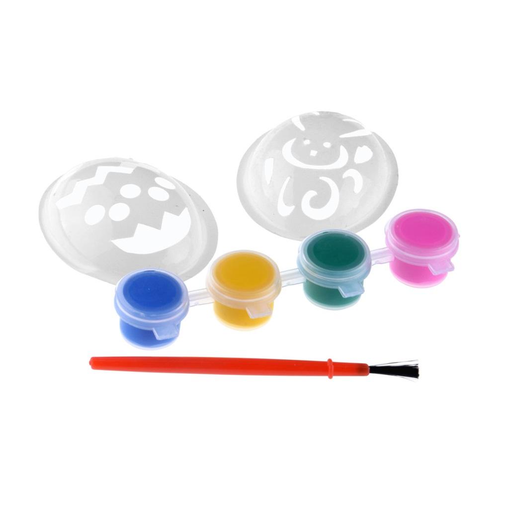 Komplet do tworzenia kolorowych pisanek składający się z dwóch szablonów, kolorowych farbek i pędzelka. Idealne do dekorowania wielkanocnych styropianowych jajek razem z dzieckiem.