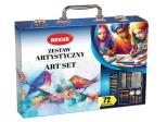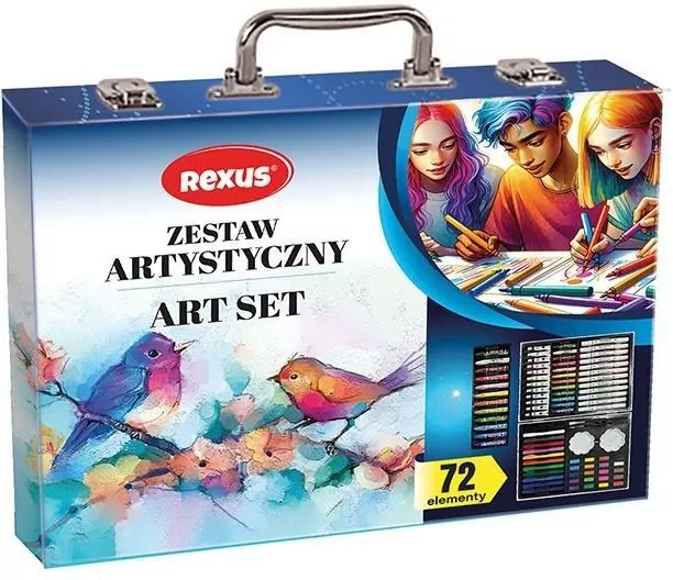 Zestaw artystyczny zawiera 72 elementy. W jego skład wchodzi: 20 farb akwarelowych, 12 wykręcanych kredek, 12 flamastrów akwarelowych, 12 pasteli olejnych, 12 mazaków, 2 pędzelki, 1 paletka