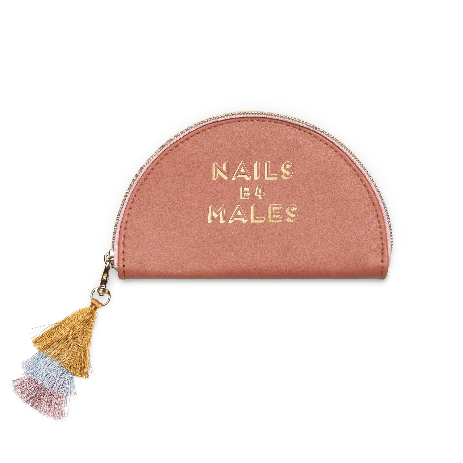 Etui zestawu zostało wykonane z wegańskiej skóry ze złoceniami i uroczymi frędzlami przy suwaku.
