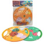 W skład zestawu wchodzą dwie obręcze oraz dwa elastyczne pompony do odbijania. Można odbijać samodzielnie ćwicząc koordynację ruchową lub grać w dwie osoby. Świetna propozycja do zabawy dla dzieci na zewnątrz. Średnica pomponów ok. 11 cm Średnica tarczy: 34 cm . Ilość elementów: 2 tarcze oraz 2 elastyczne pompony do odbijania. Kolor produktu: wielokolorowy.