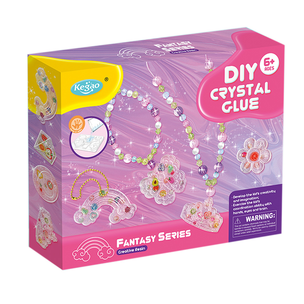 Zestaw składa się z: silikonowej formy z 6 wzorami, kryształków, koralików, sznureczków, pęsety, 4 łańcuszków, 2 bagietek do mieszania, kubka z miarką, papieru ściernego oraz 2 buteleczek żywicy epoksydowej, z której wytwarzamy wzory. Wymiary opakowania: 24.5 x 4.5 x 20 cm