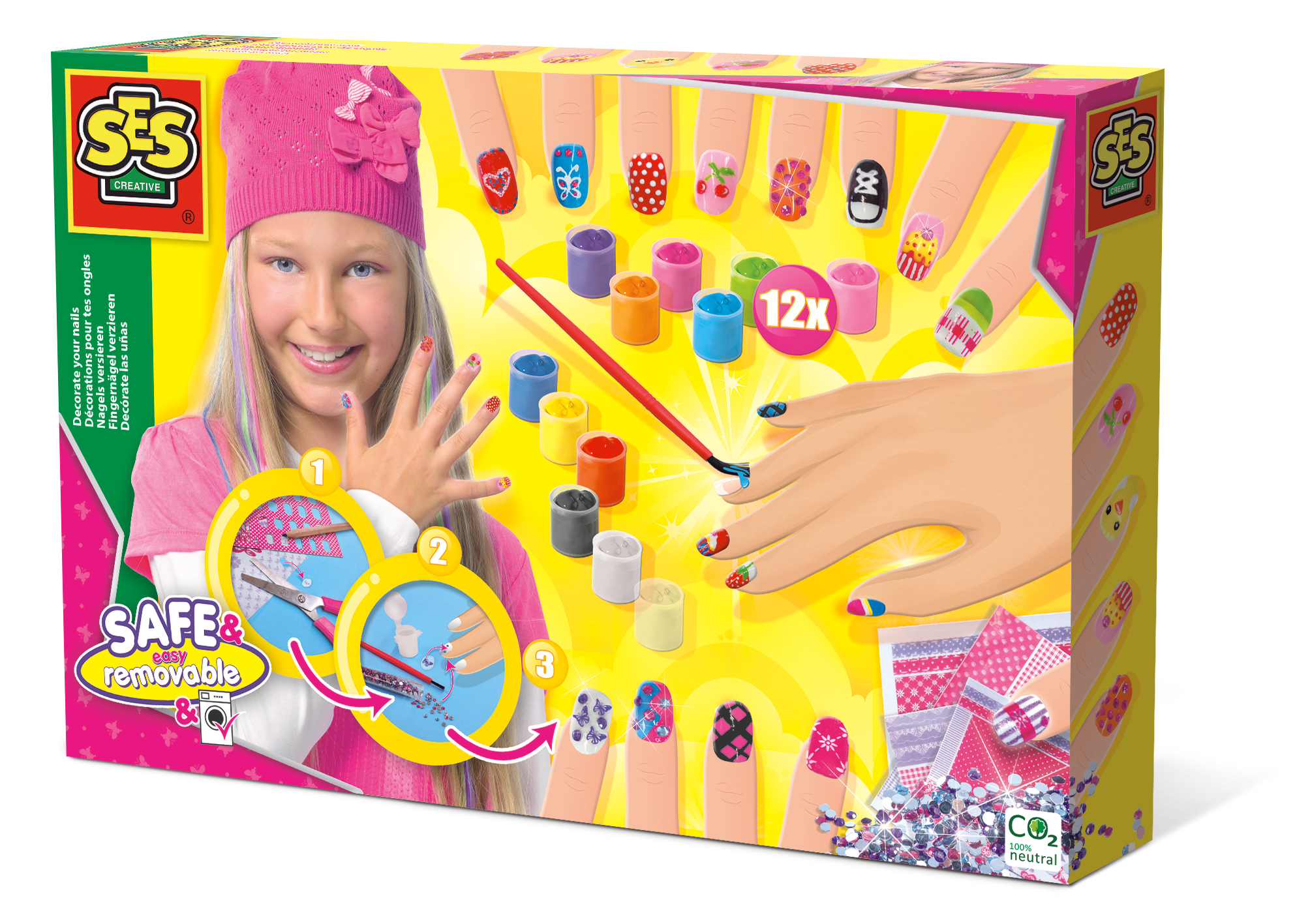 Każda dziewczynka chce pięknie pomalować swoje paznokcie. Ten bezpieczny zestaw do malowania i dekorowania paznokci zawiera 12 pojemniczków z bezpiecznym i łatwo zmywalnym lakierem do paznokci, dekoracyjne kamyczki, papier z wzorami, narzędzia: pędzelek, wzornik pomiaru wielkości paznokci, drewniany patyczek, ołówek, instrukcję. Na każdym paznokciu można stworzyć inny projekt z użyciem lakieru i papieru o wielu różnych wzorach. Cechy: zestaw ten to bezpieczna wersja malowania paznokci, zwykły lakier do paznokci jest zrobiony z rozcieńczalnika, co jest niezgodne z normą EN71 dotyczącą zabawek. Nasz lakier bazuje na wodzie i jest całkowicie bezpieczny, użyte kolory są jasne i modne, lakier jest łatwy do zmycia z rąk oraz łatwo spieralny z ubrań i innych tkanin, dekoracyjne kamyki i papier będą dobrze trzymać się na lakierze, dzięki wzornikowi pomiaru wielkości paznokci łatwo wytniesz z papieru właściwy kształt, drewniany patyczek pomoże dopracować najdrobniejsze szczegóły.