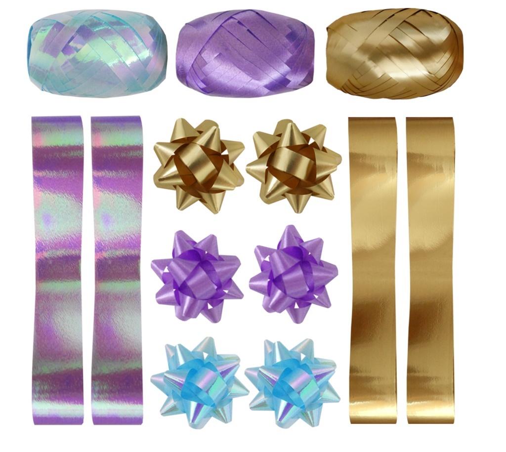 Zestaw rozetek oraz wstążek, idealne do pakowania prezentów.