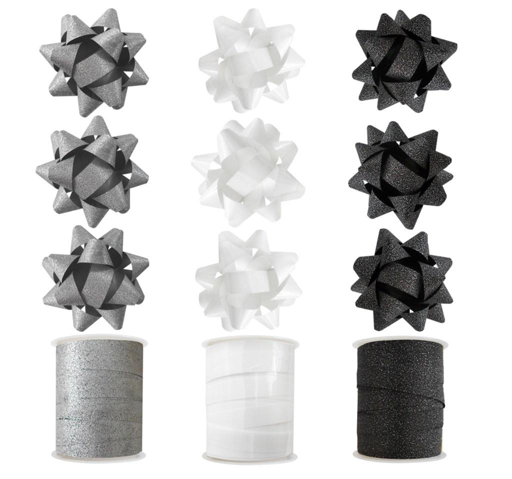 ZEstaw do pakowania z rozetkami, biały, srebrny oraz czarny.