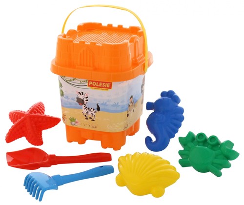 Zestaw zawiera: wiaderko-zamek, sito-zamek, łopatka, grabki, foremki (krab, muszla, konik morski, rozgwiazda)