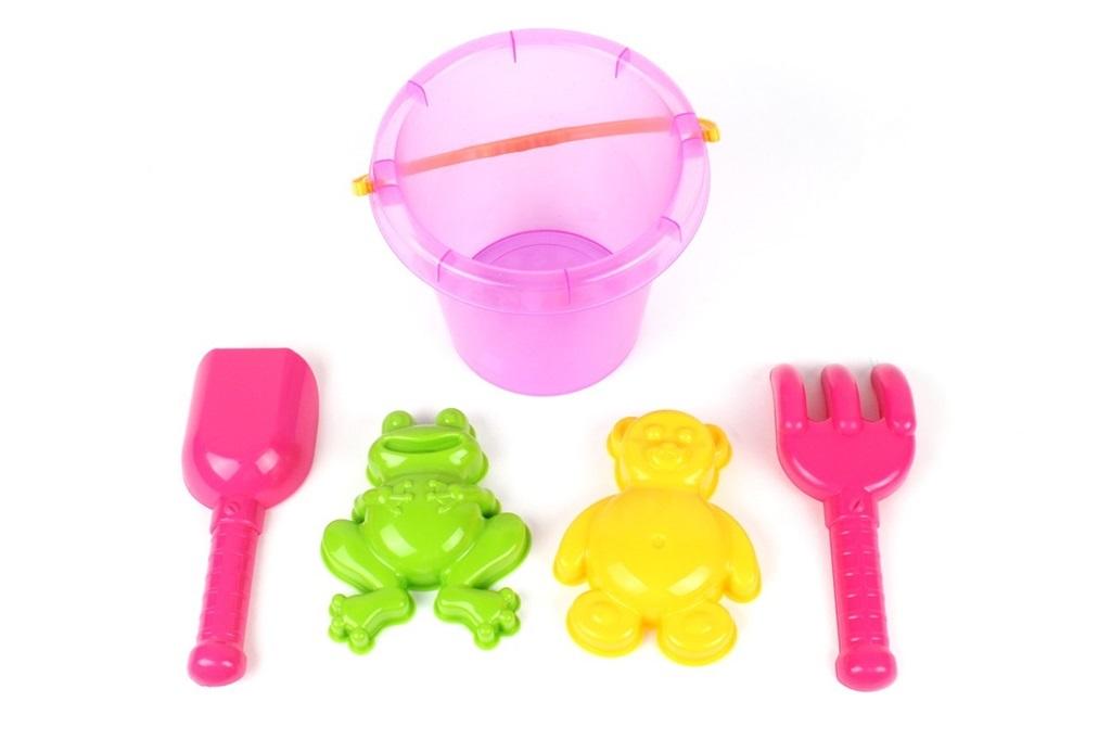 Zestaw zawiera: wiaderko, dwie foremki do piasku - żaba i miś, grabki i łopatkę. Zestawy wykonane są z wysokiej jakości, bezpiecznego, bezwonnego tworzywa sztucznego.