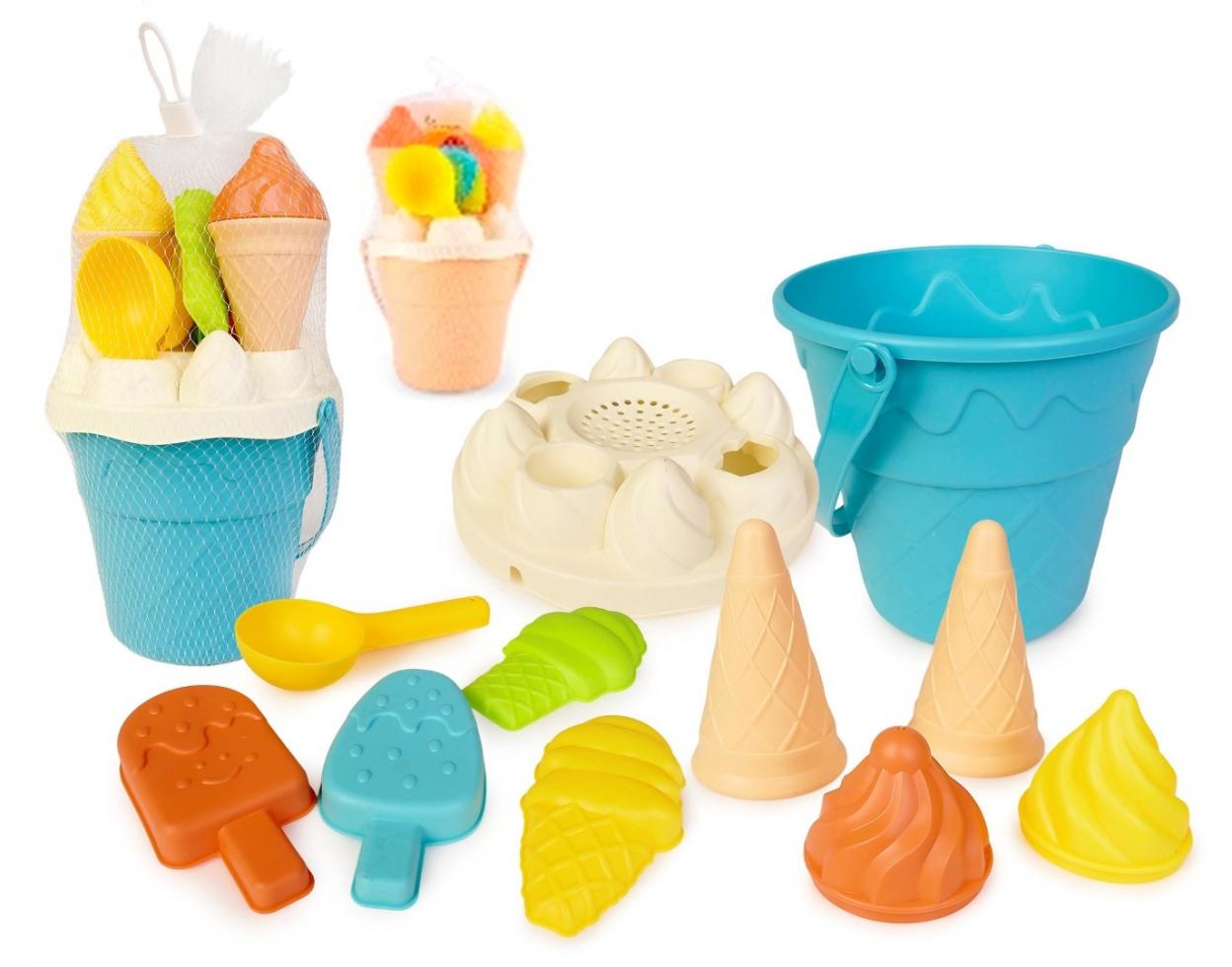 W zestawie: wiaderko, sitko, łopatka, 8 foremek do robienia lodów z piasku; wym. opak.: 17 x 28 cm; pakowane w siatkę; 3+