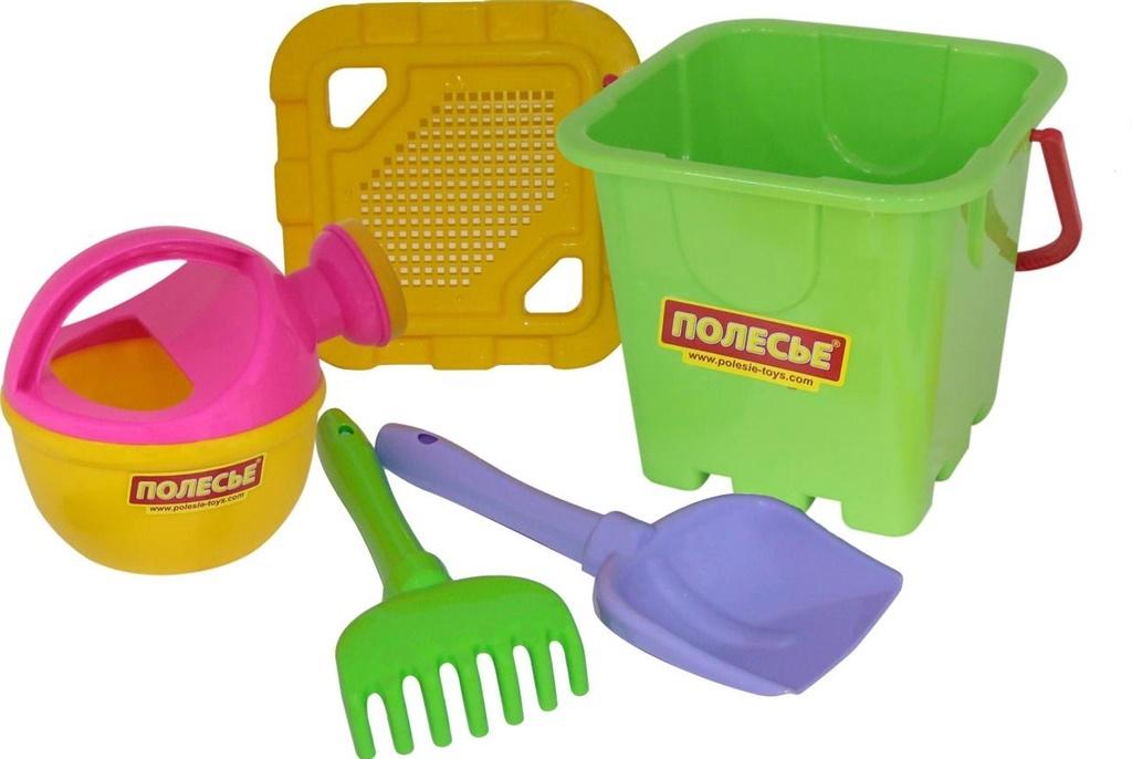 W zestawie: wiaderko, sito, łopatka, grabki, konewka mała.
