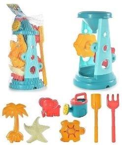 W zestawie: młynek z sitkiem, łopatka, grabki, konewka, 4 foremki do piasku: rozgwiazda, palma, słonik, żółw, pakowane w siatkę, wym. opk: 16 x 16 x 25 cm., 3+