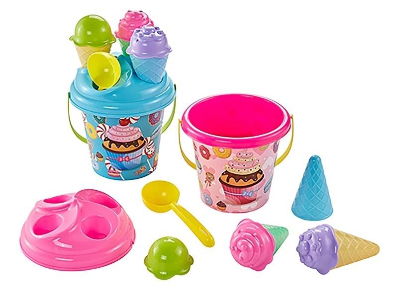 W zestawie: wiaderko, 3 foremki dwuczęściowe w kształcie lodów, łopatka, 2 kolory, pakowane w siatkę, wym. zestawu: 16 x 10 x 26 cm, 3+