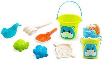 W ZESTAWIE: WIADERKO Z NADRUKIEM HIPOPOTAMA, ŁOPATKA, GRABKI, NAKŁADKA W KSZTAŁCIE KONEWKI, 2 FOREMKI, WYS. WIADERKA: 23 CM, WYM. OPK: 21 X 16,5 X 23 CM, 3+