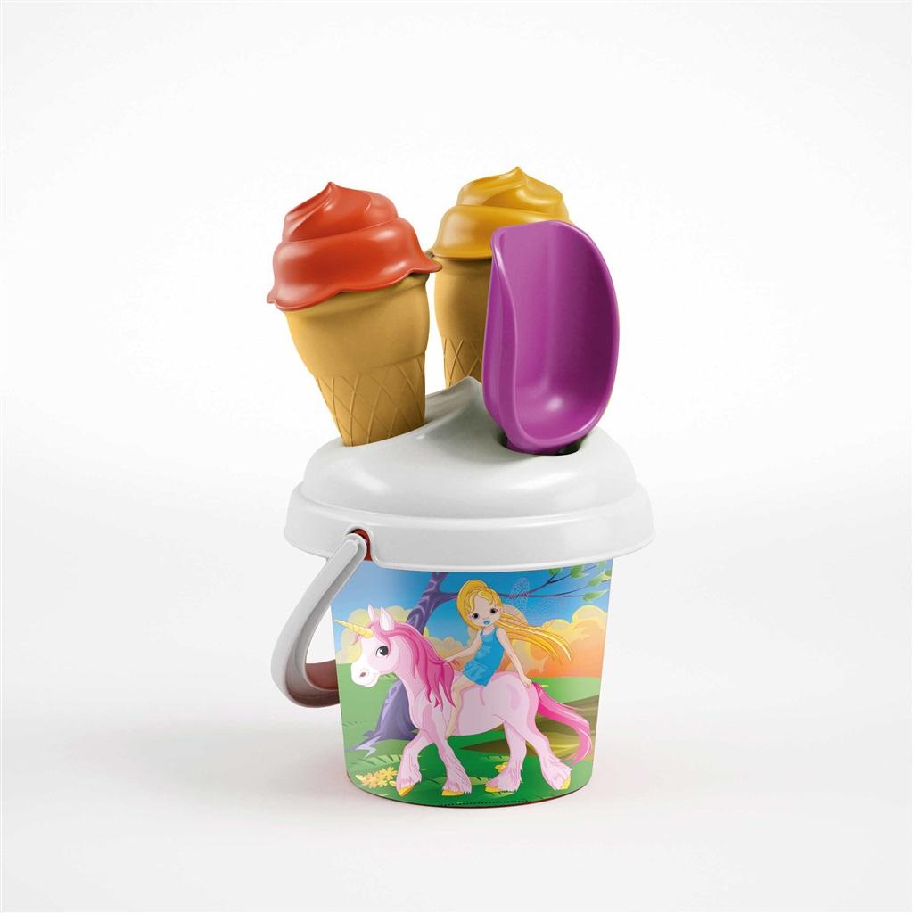 Zabawy w piasku to kopalnia możliwości. Wiaderko ozdobione kolorowym wizerunkiem jednorożca z foremkami w kształcie lodów z łopatką zapewni wiele godzin fantastycznej zabawy, ponadto sprawi wiele radości małym miłośniczkom magicznych jednorożców. Zestaw idealnie sprawdzi się jako prezent dla każdej dziewczynki. Plastikowe wiaderko sprawdzi się do przenoszenia wody czy piasku gdy dziecko zapragnie wybudować zamek z obronną fosą. Wiaderko zastąpi również foremki, gdy maluch będzie chciał stawiać babki. Łopatka pozwali kopać tunele czy też zakopać skarby a dzięki foremkom w kształcie lodów Twoja pociecha stworzy prawdziwą lodziarnię oraz wyjątkowe piaskowe formy w postaci apetycznych lodów.