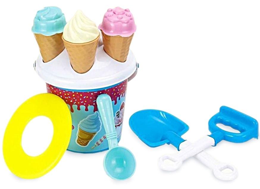 W zestawie: wiaderko do piasku wys. 16 cm, łopatka, grabki, łopatka do lodów, 3 foremki w kształcie lodów, podstawka na lody, pakowane w siatkę, wym. opak. 18 x 18 x 31 cm, 3+