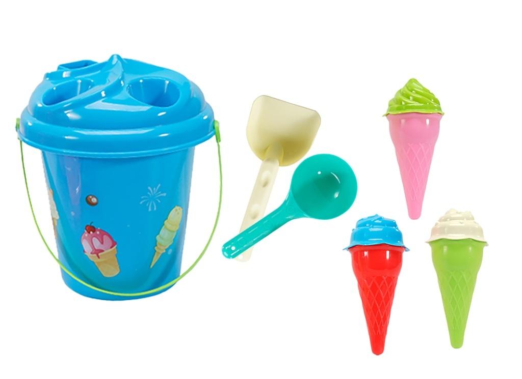 W zestawie: wiaderko wys. 15 cm, 2 łopatki, 3 foremki w kształcie lodów, pakowane w siatkę, wym. opak. 25 x 18 cm, 3+