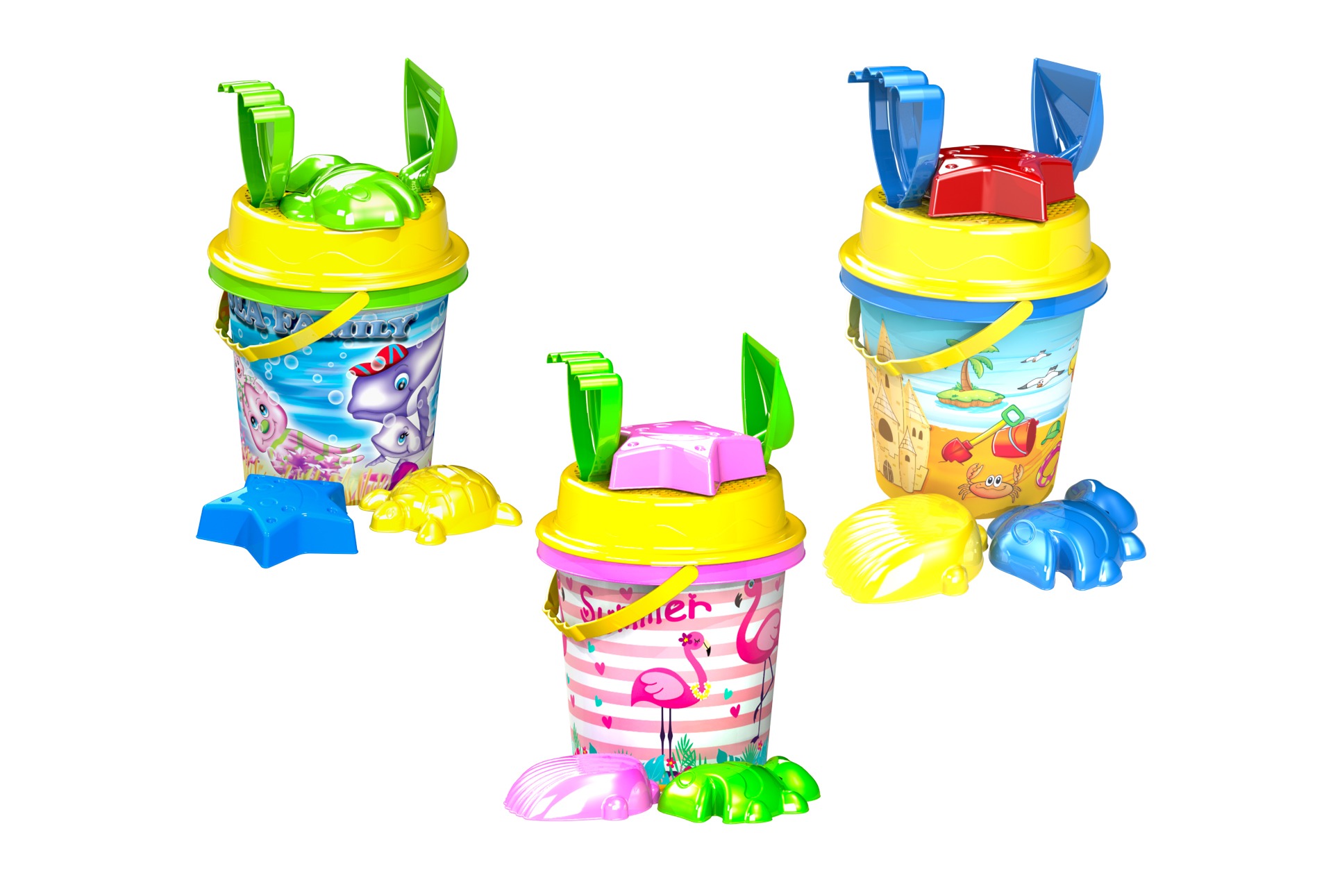 W zestawie: wiaderko z sitkiem śr. 17 cm., łopatka, grabki , 3 foremki ,
