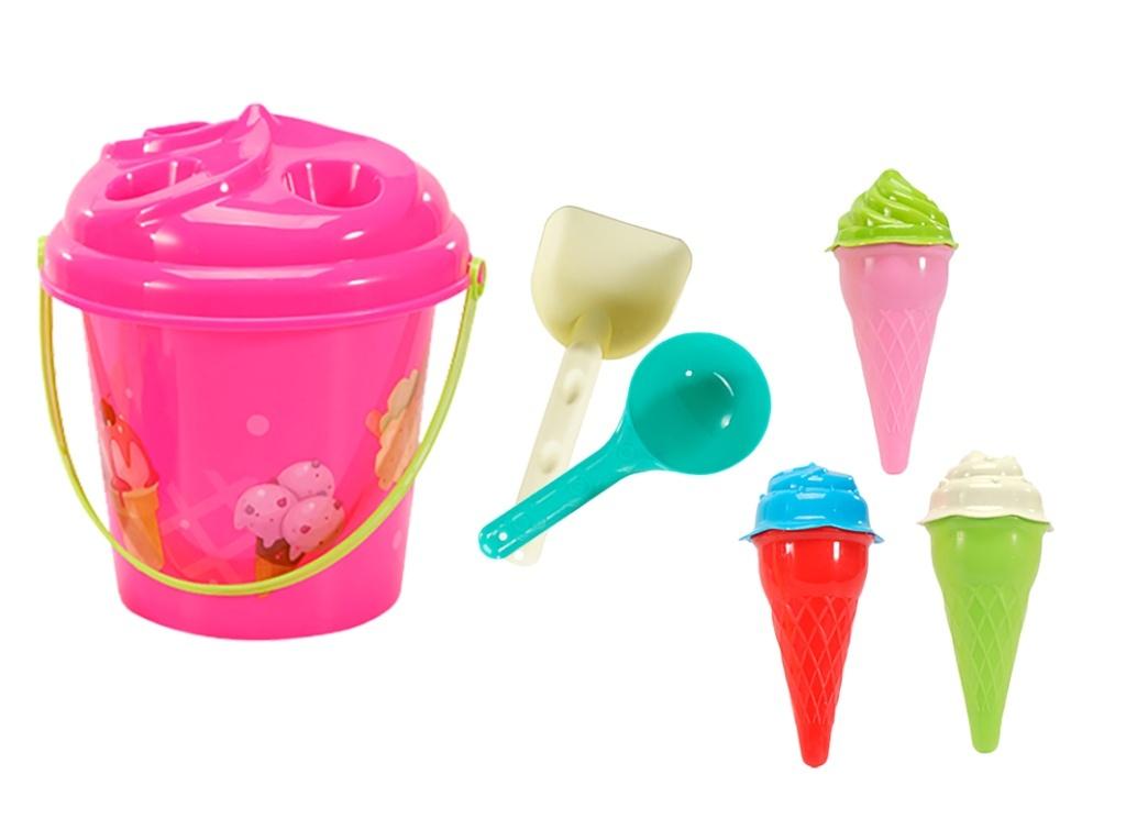 W zestawie: wiaderko wys. 15 cm, 2 łopatki, 3 foremki w kształcie lodów, pakowane w siatkę, wym. opak. 25 x 18 cm, 3+