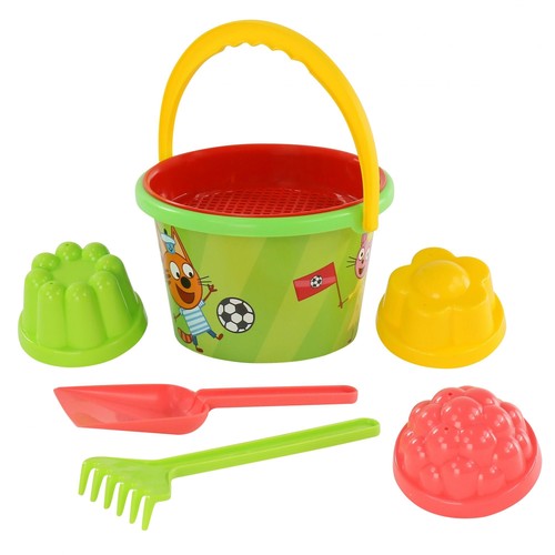 Zestaw do piasku: wiaderko średnie z nalepką, sitko, łopatka, grabki, 3 foremki