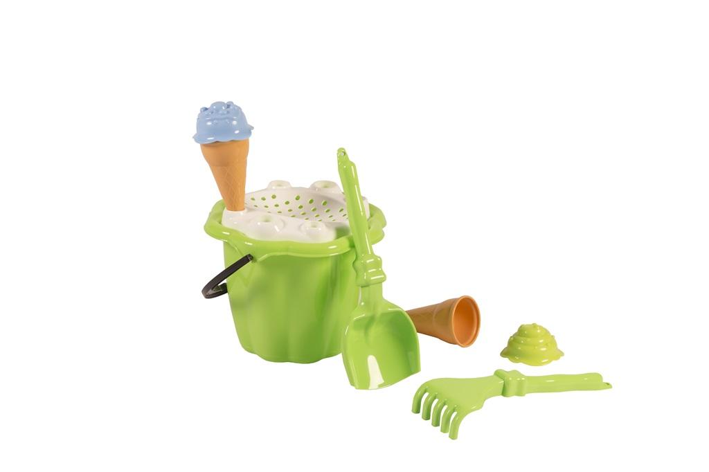 "Zestaw do piasku to nieodłączny element każdej wyprawy na plażę czy też do piaskownicy. Prezentujemy zestaw, który pozwoli dziecku stworzyć własną lodziarnię lub cukiernię. Zestaw składa się z: wiaderka sitka grabek łopatki 2 foremek w kształcie lodów Prezentowany zestaw pozwala nie tylko na budowanie babek z piasku czy zamku ale również ciasteczek oraz lodów. Dziecko uczy się odgrywania ról co korzystnie wpływa na kreatywność i wyobraźnię. Z takim zestawem dziecko chętniej spędza czas na świeżym powietrzu! Produkt zapewnia wiele godzin kreatywnej zabawy! "