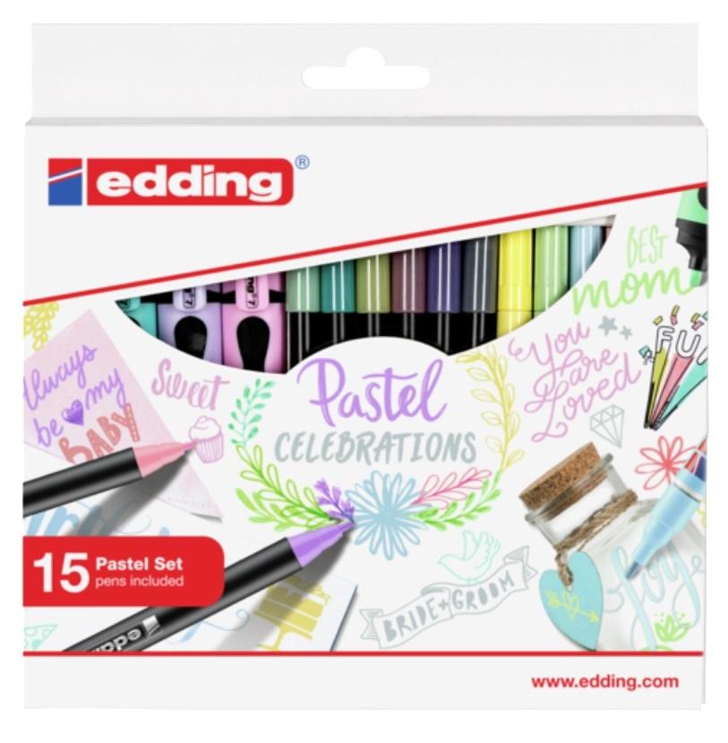 Kolory: edding 7: 1x pastelowy fiolet, pastelowy żółty, pastelowy zielony, pastelowy róż, pastelowy niebieskie, edding 751: 1x pastelowy żółty, pastelowy zielony, pastelowy róż, pastelowy niebieski edding 1200: 1x srebrnoszary, kwiat wiśni, melonowy, jagodowa lawenda, słodka mięta, sorbet jabłkowy.