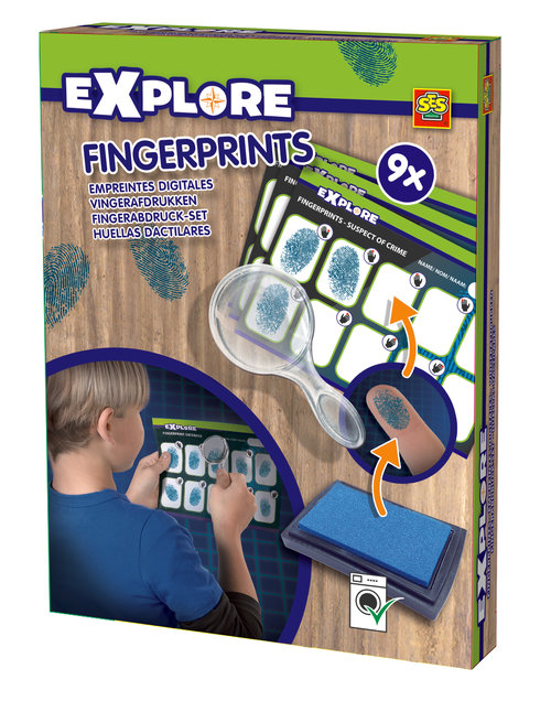 EXPLORE – seria dla małych odkrywców. Z tym zestawem możesz zebrać odciski palców Twoich bliskich, odciskając je z tuszem na specjalnych kartach do zbiórki odcisków. Kto ma jaki rodzaj odciska palców? Możesz użyć szkła powiększającego aby znaleźć odcisk palca kogoś, kogo znasz w domu. Porównaj je z odciskami zebranymi na karcie aby sprawdzić do kogo należą. W zestawie znajduje się 9 kart do zbierania odcisków, poduszkę z tuszem, szkło powiększające, instrukcję. Wyprodukowano w Holandii.Zabawka dla dzieci 5+