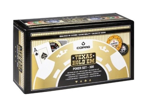 Texas Hold'em Poker Set 300 zawiera 300 żetonów ($5, $25, $50, $100 i $500), talię kart Texas Hold'em 100% plastic jumbo index, metalowy żeton Dealera i książeczkę z zasadami gry w pokera. Wszystkie elementy umieszczone są w luksusowym, drewnianym pudełku.