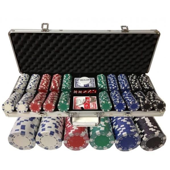 Zestaw 500 żetonów do pokera w srebrnej, aluminiowanej walizce.
