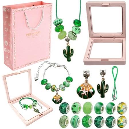 Zestaw obejmuje 10 zielonych koralików, 2 urocze charmsy, bransoletkę oraz rzemyk, dając dziecku mnóstwo możliwości twórczej zabawy.