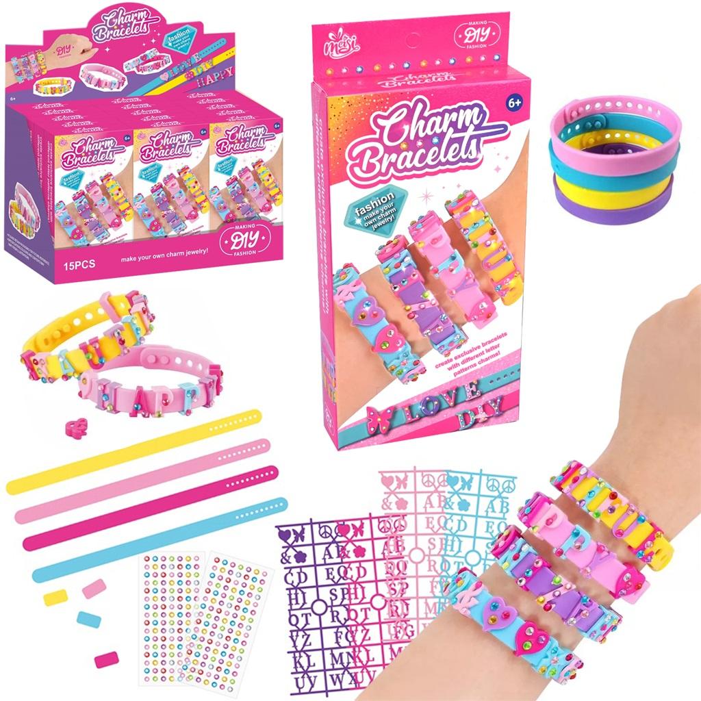 Zestaw do robienia bransoletek z literkami, wzorkami i diamencikami.