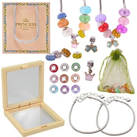 Głównym elementem zestawu jest ozdobny woreczek, w którym znajdują się bransoletki oraz kolorowe koraliki. Bransoletki są zaprojektowana tak, aby dziecko mogło nawlekać koraliki i charmsy według własnych upodobań, tworząc unikalne kompozycje, które odzwierciedlają ich indywidualny styl.