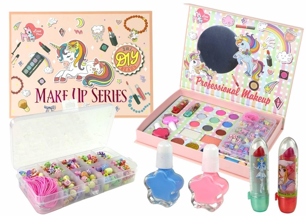 Elementy zestawu:- cienie do powiek- 2 lakiery do paznokci- 2 szminki- 2 packi do cieni - koraliki- gumka do robienia bransoletek