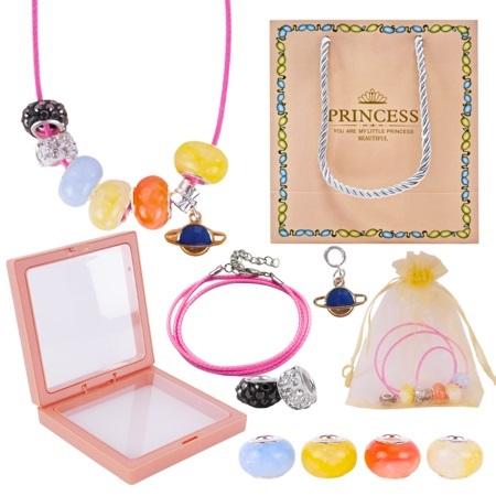 Głównym elementem zestawu jest ozdobny woreczek, w którym znajduje się rzemyk oraz kolorowe koraliki. Rzemyk jest zaprojektowany tak, aby dziecko mogło nawlekać koraliki i charmsy według własnych upodobań, tworząc unikalne kompozycje, które odzwierciedlają ich indywidualny styl.