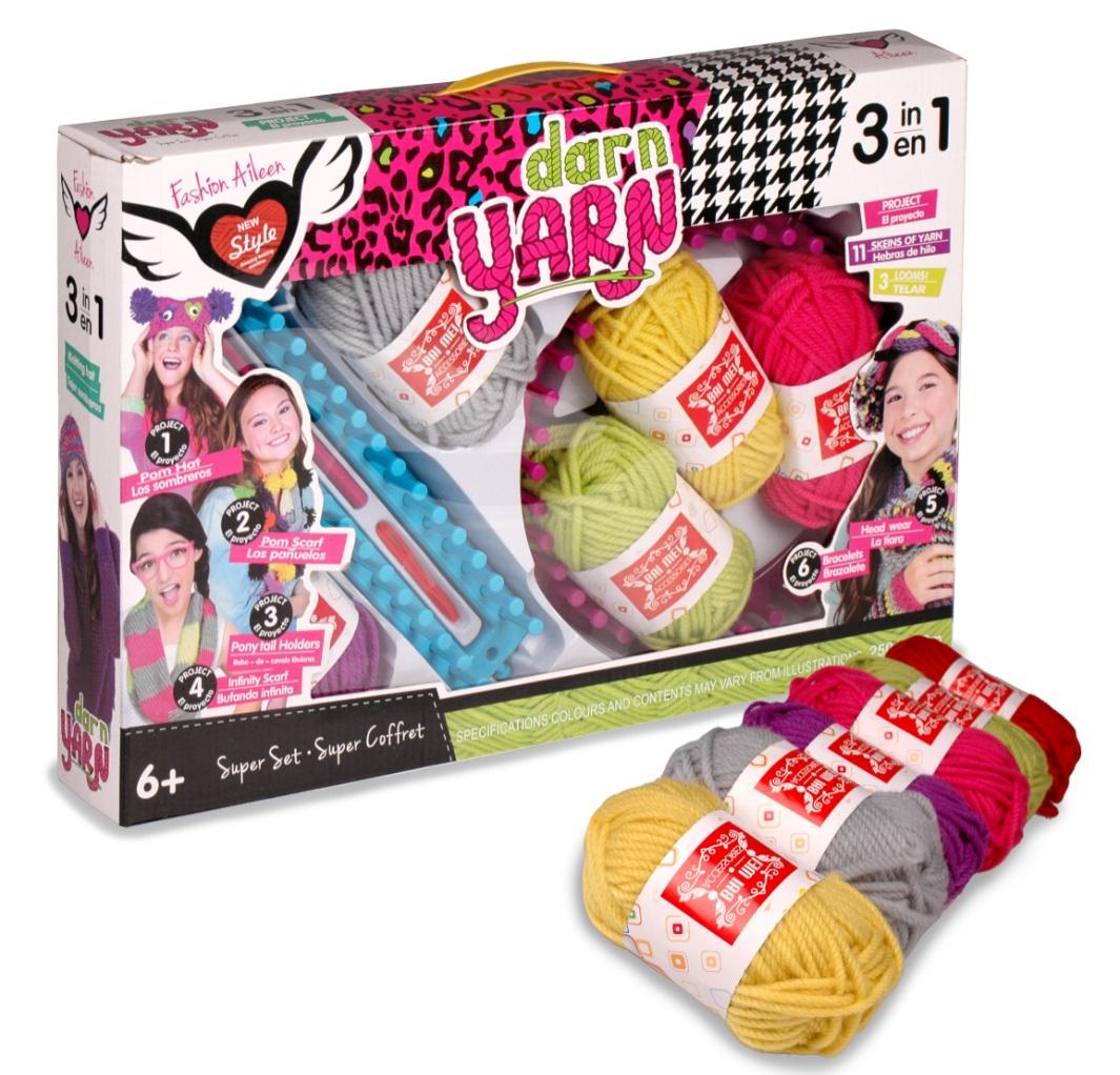 ZESTAW UMOŻLIWIA STWORZENIE 3 PROJEKTÓW: CZAPKI, SZALIKA ORAZ SZALIKA Z POMPONAMI, W ZESTAWIE: 5 KOLORÓW WEŁNY, 3 UCHWYTY, PĘSETĘ, SZYDEŁKO, WYM. OPK: 48CMX32CMX7 CM., 6+