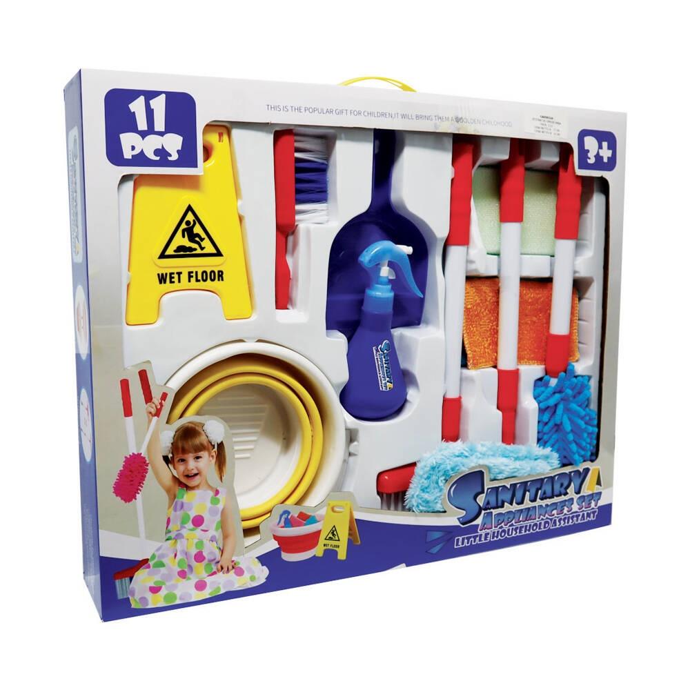 Zestaw do sprzątania, który zawiera: ścierkę, butelkę na płyn, mopa, szczotkę do kurzu, zmiotka, 2 szczotki do zamiatania, wiadro, znak ostrzegawczy. Produkt nie potrzebuje baterii. Zabawka przeznaczona dla dzieci powyżej 3 roku życia.