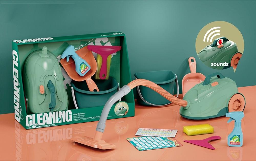 Duży zestaw do sprzątania. W jego skład wchodzi odkurzacz, wiaderko, szufelka, pojemnik do spryskiwania oraz gąbka i maszynka do zbierania wody.
