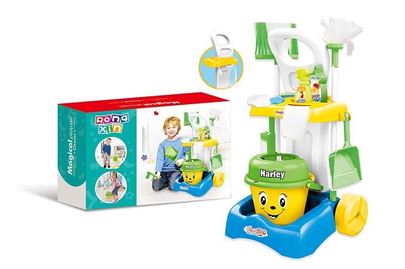W zestawie: wózek na akcesoria do sprzątania, mop, wiaderko do mopa, szczotka, szufelka, worek na śmieci, ściereczka, gąbka, buteleczki, szczotka z gąbką, naklejki.